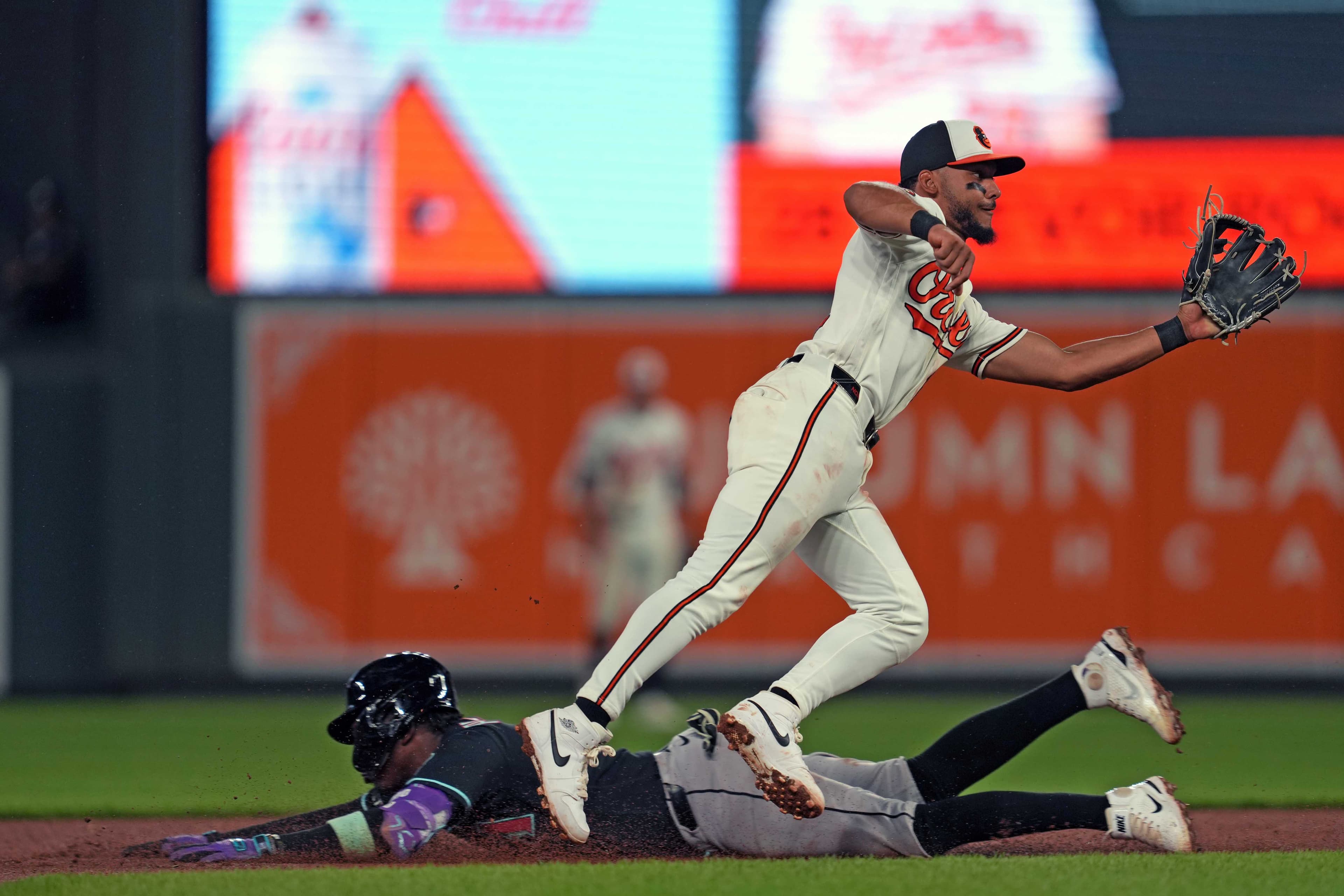 Apr 14, 2026; Baltimore, Maryland, USA; Arizona Diamondbacks shortstop Geraldo Perdomo (2) steals second base during the fifth inning against the Baltimore Orioles at Oriole Park at Camden Yards. Mandatory Credit: Mitch Stringer-Imagn Images | Mitch Stringer-Imagn Images Well, it was bound to happen. Trevor Rogers was bound to have a bad night.