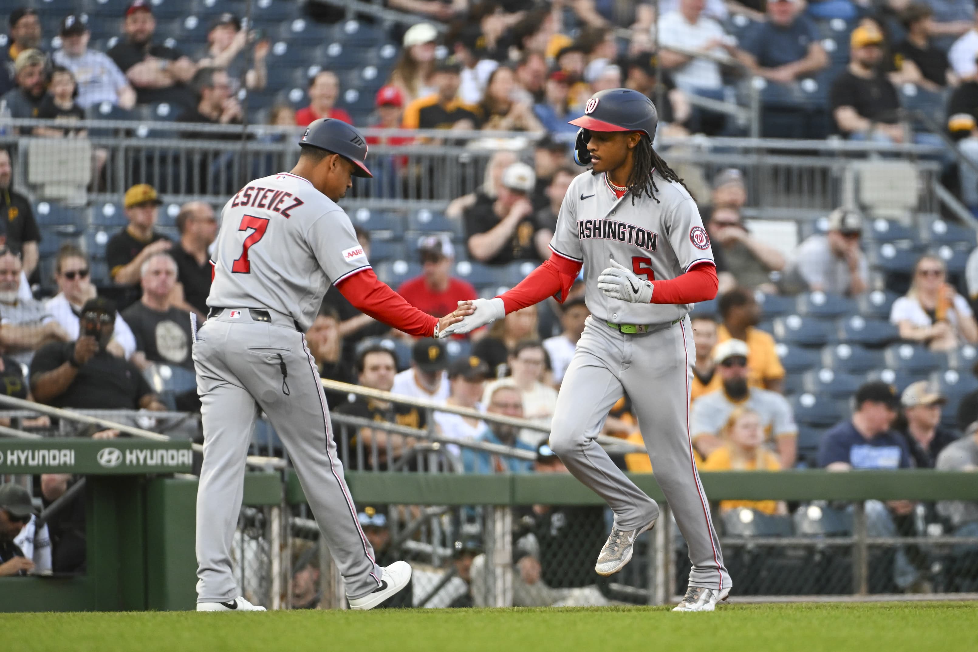 PITTSBURGH, PA - APRIL 13: CJ Abrams #5 of the Washington Nationals celebrates with third base coach Victor Estevez #7 after hitting a home run in the first inning during the game between the Washington Nationals and the Pittsburgh Pirates at PNC Park on Monday, April 13, 2026 in Pittsburgh, Pennsylvania. (Photo by Christopher Denver/MLB Photos via Getty Images) | MLB Photos via Getty Images The Nationals crashed and burned in the first game of their four game set with the Pirates. However, the great thing about four game series is it allows you to have a clunker. The Nats will look to bounce back tonight.